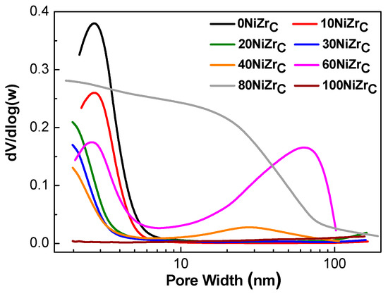 The pore size distributions of the samples of the first series are illustrated in Figure 3. The catalysts: 0NiZrC, 10NiZrC, 20NiZrC and 30NiZrC show unimodal pore size distributions with the peak centered in the range <3 nm. On the other hand, the 40NiZrC and 60NiZrC catalysts exhibit a bimodal pore size distribution; the first peak appears in the aforementioned range and the second one in the range of 30 to 70 nm. The 80NiZrC sample has pores of various sizes starting from micro- to macro-pores covering all the range of pores <80 nm, while the catalyst 100NiZrC has no pores justifying its low specific surface area (Table 1). The size of the peak in the samples 0NiZrC, 10NiZrC, 20NiZrC and 30NiZrC decreases with the nickel content and its maximum is shifted towards to micropores. The above explain the decrease observed in SSA and PV with respect to those of the bare support (Table 1). The further decrease of this peak and the appearance of the second one in the sample 40NiZrC resulted, respectively, to an additional decrease in SSA and increase in PV (Table 1). The relatively high magnitude of the second peak in the sample 60NiZrC is in line with the increase in SSA and PV, with respect to those in the sample 40NiZrC, (Table 1). Finally, the wide pore size distribution in the sample 80NiZrC, which is extended to larger pores, explains its resistance to a dramatic decrease of SSA and PV as one would expect due to the high Ni loading.