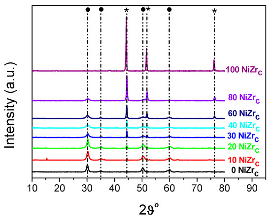 The XRD patterns of the activated catalysts of the first series are illustrated in Figure 4. Inspection of these patterns indicates the formation of two main phases, namely metallic nickel (2θ = 44.447°, 51.846°, 76.347°, JCPDS 04–0850) and zirconium oxide in tetragonal and/or cubic structure (2θ = 30.236°, 35.087°, 50.229°, 60.079°). According to the literature [31] the XRD pattern of t-ZrO2 exhibits peaks at 2θ = 30.2°, 35.2°, 50.6°, and 60.2° [JCPDS 80-0965]. Peaks at 2θ = 30.3°, 35.14°, 50.48°, and 60.2° [JCPDS 27-0997] reveal the presence of c-ZrO2. Small amounts of nickel chlorides were also detected at least in the samples 10NiZrC and 20NiZrC (2θ = 15.37° JCPDS 22-0765).