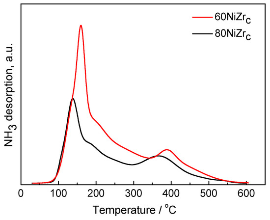 The acidity of the catalysts was studied by NH3-TPD experiments. Figure 5 illustrates the NH3-TPD curves for the 60NiZrC and 80NiZrC catalysts, as representative examples for the first series of catalysts. Both catalysts exhibits high but different populations of weak acid sites (desorption temperature < 300 °C), similar and small populations of intermediate acid sites (300 °C < desorption temperature < 450 °C) and very few, if any, strong acid sites (desorption temperature > 450 °C) [32]. The high population of weak acid sites could be easily connected with the chlorine content of these catalysts detected by EDS analysis. Indeed, the lower population of acid sites found on the 80NiZrC catalyst surface (Table 1, Figure 5) is in accordance to the lower wt % Cl content of this sample (see Table 2)