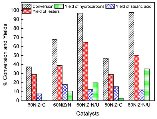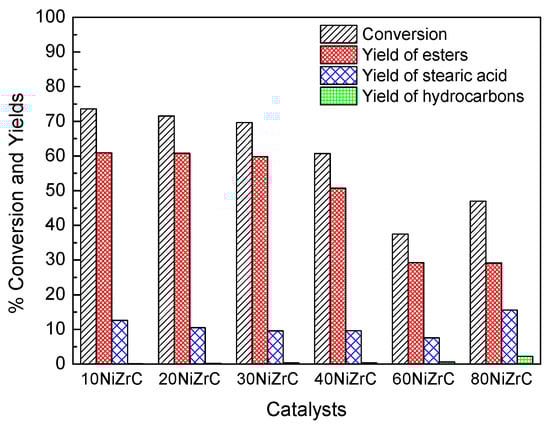 Taking into account the products detected, the aforementioned mechanistic scheme and inspecting Figure 6, we may conclude that SDO proceeds through the aforementioned scheme over the catalysts of the first series. However, it seems that esterification of the produced intermediate acids and alcohols is much faster compared to the decarbonylation of aldehydes and the dehydration of alcohols, favoring thus the formation of wax esters with both hydrocarbon chains corresponding to primary fatty acids and fatty alcohols. Wax esters constituted by long chain fatty acids and fatty alcohols have shown potential for many applications in cosmetics, pharmaceuticals, food, polymers, and leather products [33]. They are commonly prepared by reaction of carboxylic acids or activated acid derivatives, e.g., acid chlorides or anhydrides, with alcohols [34]. It is well known that acid catalysts, as in our case, accelerate esterification reactions [35]. On the other hand, the strength of catalyst acidity affects the cracking behavior and catalyst deactivation by the deposition of polymerized high boiling hydrocarbons on its surface [36]. Fortunately, the catalysts of the first series exhibit high population of weak acid sites, small population of intermediate acid sites and very few, if any, strong acid sites (Figure 5). Therefore, these catalysts are very convenient for producing long chain esters from biomass in the frame of green chemistry but less active for producing green diesel. We have attributed the relatively low activity of the samples for green diesel production to the poisoning of the selective deoxygenation sites by the chlorine present on the catalyst surface. The aforementioned effect of chlorine is reported for the first time. However, the study of the first series of catalysts allowed us to select the most promising nickel loadings (60NiZrC, 80NiZrC) for SDO. The former loading has also been proved to be the optimum one in the nickel–alumina co-precipitated catalysts [22].