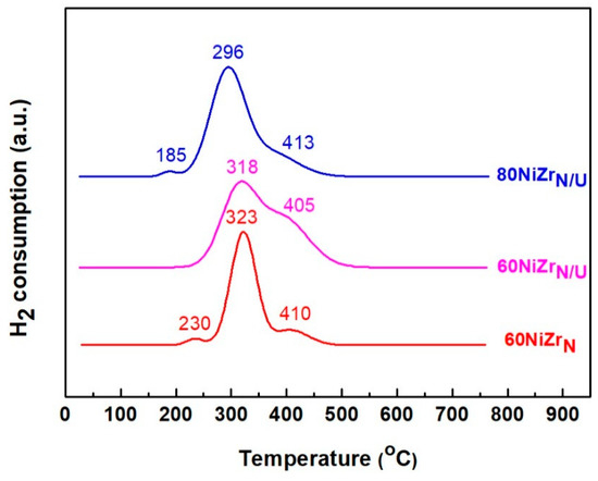 The H2-TPR profiles of the catalysts of the second series are illustrated in Figure 8. Comparing these profiles with those of Figure 2, we can conclude that the replacement of zirconium oxy-chloride by zirconium oxy-nitrate causes the appearance of a reduction peak at temperatures higher than 400 °C indicating a stronger interaction between the Ni oxo-phase and zirconium oxide phase [37]. This effect is more obvious when the NH3 co-precipitation method is replaced by the urea hydrothermal co-precipitation one (see the H2-TPR profiles of 60NiZrN and 60NiZrN/U catalysts).