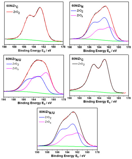 Zr3d core level spectra of the catalysts of the second series (60NiZrN, 60NiZrN/U and 80NiZrN/U) and two of the samples of the first series (60NiZrC and 80NiZrC) activated in situ by H2.