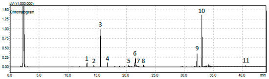 A representative chromatogram obtained for the SDO of sunflower oil over the sample 80NiZrN/U [reactant volume to catalyst mass ratio (100 mL)/(1 g), reaction time = 9 h]: (1) n-C15, (2) n-C16, (3) n-C17, (4)-C18, (5) octadecanol, (6) stearic acid, (7) methyl stearate (elution time = 21,787 min), (8) propyl stearate (elution time = 22,827 min), (9) palmityl stearate (elution time = 32.151 min), (10) stearyl stearate (elution time = 33,016 min), and (11) unreacted natural triglycerides.