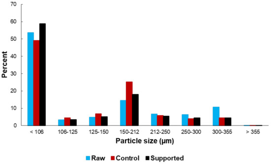 Figure 1 shows scanning electron microscopy/energy-dispersive X-ray (SEM/EDX) images of the raw, control and Ni-Mo supported drill cuttings. The particle size of the drill cuttings was <350 µm in accordance with the preparation procedure. Interestingly, the average size of the control drill cuttings and supported drill cuttings appeared to be smaller than that of the raw drill cuttings, suggesting that wet impregnation procedure and/or heat treatment introduced changes to at least the morphology of the drill cuttings. This is confirmed through the particle size distribution for the three different types of cuttings, as seen in Figure 2. Finer drill cuttings most likely better disperse during the reaction. It has been shown earlier that greater dispersion of fine solids within the heavy oil feed improves the dispersion of the coke precursors during upgrading, resulting in more effective exposure to hydrogen donors [30,45]. Subsequently, it is anticipated that the TI yield would decrease, while the liquid yield would increase. Details on the role of dispersion on product quality and quantity will follow.