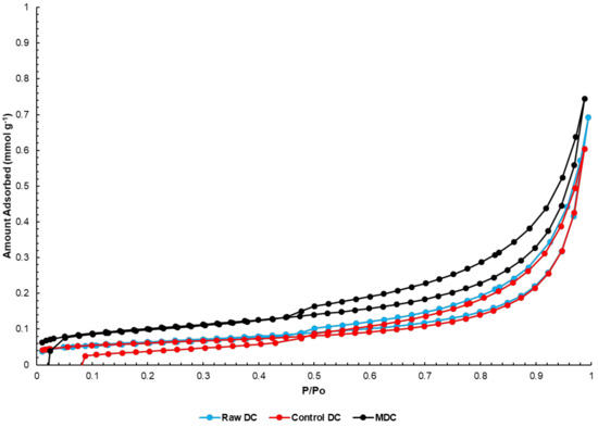 N2 adsorption-desorption curves for the drill cuttings samples are shown in Figure 3. It can be seen that the isotherms follow a typical H3 type hysteresis curve [50]. Such a curve does not provide very reliable pore volume information, however it is expected that the drill cuttings have negligible pore volume, as seen in Table 2. Interestingly, the supported drill cuttings show a significantly higher BET surface area than the other two samples. This suggests that the supported drill cuttings possess a higher catalytic activity than the raw or control drill cuttings, simply by nature of the preparation step, despite the similar treatment steps control drill cuttings have been through. The higher BET surface area of the supported drill cuttings coupled with the lower pore volume relative to control drill cuttings can be understood in light of Figure 2, which shows higher population of small particles for the promoted drill cuttings. It should be noted, nevertheless, that the surface area and pore volume of the different drill cuttings is inferior to typical HDC catalysts. Therefore, higher concertation of the drill cuttings catalyst is used in this study than the typical slurry HDC catalysis, especially since drill cuttings is a waste product.