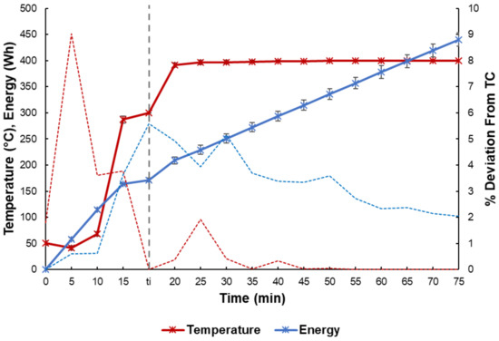 Temperature and energy profiles for HDC runs (solid), and their % deviation from thermal cracking (TC) runs (dashed). The time at which the temperature inside the reactor reached 300 °C is denoted by ti.