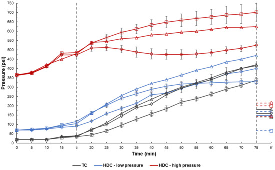 Buildup of pressure for TC and HDC runs. The time at which the temperature inside the reactor reached 300 °C is denoted by ti. The final pressure in the reactor at ambient conditions is denoted by the point at tf. Control (square), raw drill cuttings (triangle), supported drill cuttings (circle).