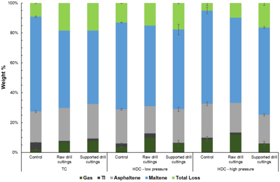 It can be seen from Figure 7 that TC control runs in presence of raw drill cuttings or supported drill cuttings produced a much greater gas yield of 6.9 wt.% and 7.7 wt.%, respectively, than non-catalytic TC, 1.8 ± 0.4 wt.%. This is also reflected in Figure 6, where the gas yield and pressure buildup of the control TC were lower than that of the TC raw drill cuttings and TC supported drill cuttings runs. On the other hand, the TI (toluene insoluble) and liquid yields were significantly higher for the non-catalytic TC runs. The increased gas yield of the supported drill cuttings over drill cuttings is likely due to increased catalytic activity as seen by BET surface area in Table 2. The drill cuttings effectively promoted cracking reactions that led to gaseous products, while inhibiting coke formation. This could also be due to the aforementioned dispersion effect, allowing hydrogen donors from the bulk phase to more readily diffuse and cap cracked molecules [29,30,31]. The extent of reduction of coke during upgrading using drill cuttings is in agreement with pasts results [39]. Therefore, in terms of yields, the modification of the drill cuttings led to not only more suitability to HDC, but also increased TC performance.