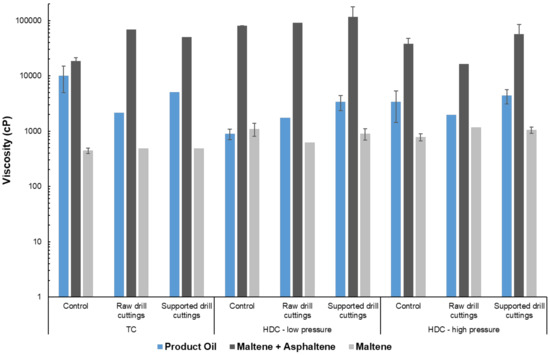 The maltene-asphaltene viscosities show a substantial increase, up to 200 times, from the product oil in all cases. The extent of increase is likely linked to the asphaltene yield of the sample, as well as losses of volatiles experienced during solvent evaporation. Asphaltenes have a very strong effect on heavy oil viscosity, and the concentration of asphaltenes increase upon loss of the volatile components [58,59,60,61,62]. For example, the TC raw drill cuttings and supported drill cuttings runs had a higher maltene-asphaltene viscosity than the TC control run, as the asphaltene yield was higher for those runs coupled with higher total losses.