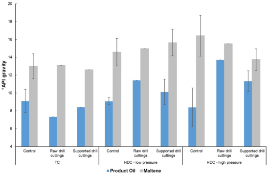 The quality of the maltene fraction for the low-pressure HDC raw drill cuttings and supported drill cuttings runs show little improvement over the control in terms of viscosity and °API gravity. The viscosities were 600 cP and 900 cP, whereas the °API gravity measurements were 15 and 16, respectively. Similar to TC, it is possible that the difference in volatiles, TI and asphaltene fractions accounted for the majority of the differences seen in the quality of the product oil.