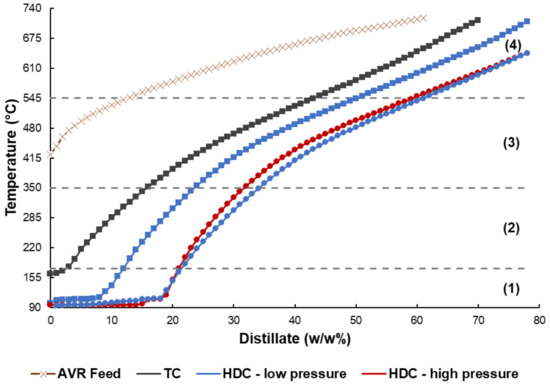 High temperature simulated distillation curves for the TC control, low-pressure HDC control and low and high-pressure HDC supported drill cuttings runs are shown in Figure 10. TC control only had 34% residue conversion, versus 43% for the control HDC at low-pressure, as reported in Table 7. The higher residue conversion is in agreement with the trend of the viscosity results, showing the greater extent of upgrading with HDC.