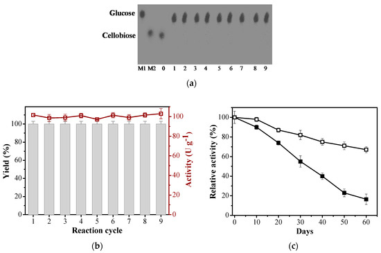 Unlike free enzymes, recycling of their immobilized counterparts offers technical and economic advantages in industrial bioreactors [14,49]. To assess the operational stability, immobilized EaBglA was applied in successive reactions using cellobiose as substrate. After each reaction cycle (30 min), the immobilized BGL was thoroughly washed several times with sodium phosphate buffer (50 mM at pH 7.0) to remove residual substrate and/or product formed. As illustrated in Figure 2a,b, after 9 cycles, agarose-GLU-IDA-Co2+-EaBglA-PEI retained approximately 100% of its initial activity with a yield of 100%. Therefore, the post-immobilization applied in the work provided a more suitable biocatalyst, thus reducing processing costs in practical applications. Besides, some studies describe that the activity of the enzyme treated with glutaraldehyde can withstand after several cycles of reuse by various investigators [50,51,52,53,54,55].