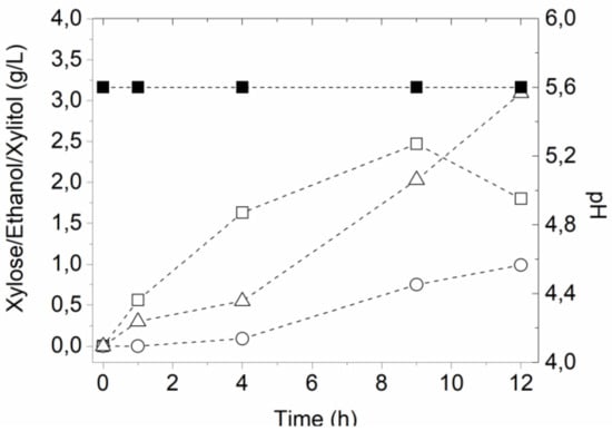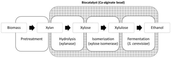 Biofuels will have a significant role in the energetic matrix of the low-carbon economy, helping to meet the goals established at Conference of the Parties (COP 21) [1,2]. Among biofuels, bioethanol production from lignocellulosic materials has been intensively studied once it was shown that these byproducts had high availability, had a low cost, and did not compete with the production of food [3]. Lignocellulosic raw materials are mainly composed of cellulose and hemicellulose (up to 70%), which are polysaccharides that, after a hydrolysis step, generate fermentable sugars, mostly xylose from hemicellulose and glucose from cellulose [4]. The use of these two polysaccharides is important for the economic feasibility of the biofuel production process.