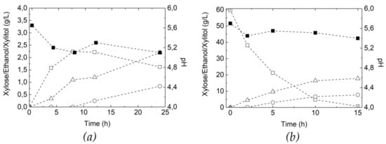 (a) SHIF of pre-hydrolyzed birchwood xylan using a biocatalyst containing 5 w % of Accellerase XY, 15 w % of XI, and 10 w % dry mass yeast (1.7 × 104 IU/L, 3.7 × 104 IU/L, and 50 g/L, respectively), pH 5.6, 150 rpm stirring, and 32 °C; (b) control experiment using xylose as substrate (SIF): pH (■), xylose (☐), ethanol (Δ), and xylitol (○).