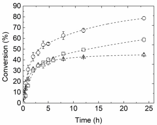 Data presented in Table 2 also prove that XI activity was greatly reduced at the SHIF pH range (5.0 to 6.0). The quaternary structure of this enzyme is composed of four subunits that are delicately folded and associated with noncovalent links and without interchain disulfide bonds [31,32]. At pH 8.0, the enzyme structure is composed of all four subunits combined, resulting in the maximum catalytic activity. However, as the pH of the reaction medium lowers, the enzyme is more likely to suffer structure distortions, unfolding and dissociating its tetrameric structure. The presence of Ca2+ ions at the low pH of the reaction medium results in a combined effect, acting both on the 3D structure and on the active site. Therefore, the performance of the SHIF process will certainly benefit from a pH control system (pH 5.6). Unfortunately, the substitution of calcium chloride by magnesium chloride in the coagulation solution during sodium alginate gelation was not possible since the resulting beads were not stable. For this reason, SHIF experiments with pH control and excess of magnesium were run, in order to minimize the inhibition of XI caused by the hydrolysis reactions, which release acids from the structures of the xylo-oligomers [35].
