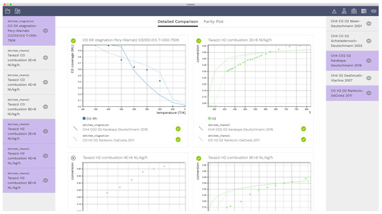A screen shot of the graphical user interface is shown in Figure 1. Experimental data are listed on the left sidebar, while the right side bar contains mechanisms. The selections on the left control which experiments to display. These items can be combined with models on the right by making selections. Four exemplary cases was selected, and each case was combined with the Karakaya–Deutschmann [14] and the Rankovic–Da Costa [17] mechanisms. In this example, only mechanisms are shown on the right-hand side. However, any other model, e.g., various diffusion models can be added to the sidebar to evaluate diffusion models.