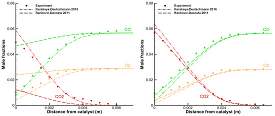 The inlet gas feed had a temperature of 313 K and contained a CO/O2 ratio of 2 diluted in argon, corresponding to a stoichiometric mixture for total oxidation of CO. The surface temperatures were 673 K (Figure 2, left) and 873 K (Figure 2, right). The lines in the figures represent model predictions by the Karakaya–Deutschmann (dash-dotted) and the Rankovic–DaCosta (dashed) mechanisms that were obtained using DETCHEM Stagnation. Good agreement between model and experiment is obtained with the Karakaya–Deutschmann mechanism, while the other fails to predict the experimental data in the case of 673 K. This is, however, not surprising, as the Rankovic–DaCosta mechanism was developed for use in high temperature combustion applications. This mechanism matches the experimental points with a surface temperature of 873 K and otherwise same conditions perfectly as shown in the right figure.