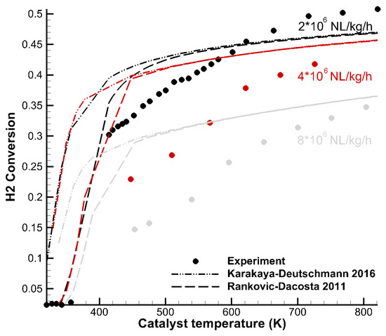 Tavazzi et al. [35] carried out H2 combustion experiments under rich conditions in an annular duct reactor. The temperature of the enclosing oven was varied, and the conversion of H2 at the end of the reactor was determined. Figure 4 shows a total of about 45 experimental data points (dots) at three different space velocities compared to model predictions of the Karakaya–Deutschmann (dash-dotted) and Rankovic–DaCosta (dashed) mechanisms. Conversion tended towards a maximum of 50% due to lack of oxygen in the rich conditions. The Rankovic–DaCosta mechanism reproduced the light-off temperature reasonably well, whereas the Karakaya–Deutschmann mechanism overpredicted H2 conversion. At approximately 500 K, both models gave the same results for all flow configurations. Furthermore, both mechanisms were less accurate at higher space velocities. This behavior may be due to diffusion effects within the washcoat, which were not captured accurately by the used diffusion model of the simulation code (DETCHEM Channel). However, it may also permit the conclusion that it is important to take into account various flow velocities and accurate diffusion models during mechanism development.