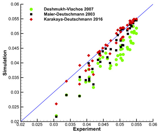 Figure 5 shows a parity plot with points from the experiments by Sui et al. [25] plotted against model data using three different mechanisms: Deshmukh–Vlachos (2007), Maier–Deutschmann (2003) and Karakaya–Deutschmann (2016). Here, x is the experimental value, and y is the corresponding value from the simulation. The experiments were conducted in a wide pressure range (2 bar to 12 bar), under total oxidation conditions with C/O2 ratios from 0.15 to 0.2, and dilution in N2. The 2D experimental data points extracted were transversely averaged and simulated using DETCHEM Channel considering the average temperature profile of the two coated plates. Overall, Karakaya–Deutschmann (2016) (red diamonds) showed best agreement with the experimental data, while the other two mechanisms generally overpredicted the CH4 conversion. However, the experimental data used for this comparison span a large pressure range up to 12 bar, which are conditions none of the mechanisms were tested under during their development. Furthermore, the simulation code used for the comparison (DETCHEM Channel) does not account for axial diffusion. Therefore, some of the discrepancies between model and experiment can likely be attributed to the simplified flow model, and not to the chemical model.