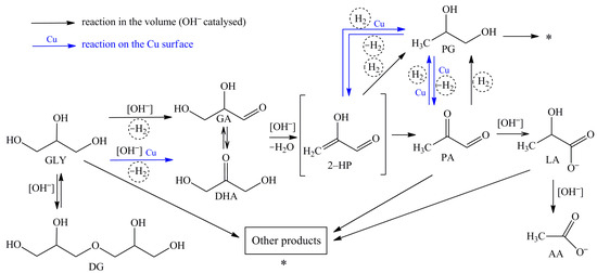 Proposed reaction pathways of the glycerol conversion into LA in the alkaline media (black arrows indicate homogeneous catalytic conversion; blue arrows show reactions occurring on the surface of Cu NPs).
