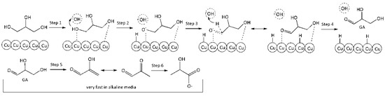 Reaction on the surface. Eley–Rideal-type reaction mechanism. Under this mechanism, conversion of molecules comprises the following steps: equilibrium adsorption of glycerol molecules on the Cu surface, interaction of adsorbed glycerol molecules with hydroxyl ions which attack from solution, formation of intermediate reaction product (GA), its instantaneous desorption into the reaction volume, where instantaneous LA formation takes place under alkaline conditions according to the scheme:
