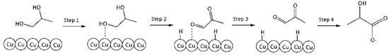 Recently, great attention is focused on the use Cu-based catalytic systems for this process such as metallic Cu0 [27], CuO/ZrO2 [28], Cu/hydroxyapatite [29,30], etc. due to their high activity, availability, recyclability, low cost, and low toxicity (especially for metallic copper). In the presence of CuO/Al2O3, Cu/SiO2, Cu2O catalysts in an alkaline media, the selectivity for lactic acid was 79.7%, 78.6%, and 78.1% with a conversion of glycerol of 75.2%, 97.8%, and 93.6% (513 K, 6 h), respectively [31].