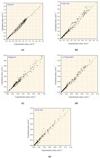 Adequacy of the obtained catalytic conversion of glycerol into LA kinetic model was evaluated using the Fisher criterion (Fc) at a significance level of 0.05 (95% confidence interval). The Fc value must be lower than the Fcrit to consider the proposed model statistically significant.