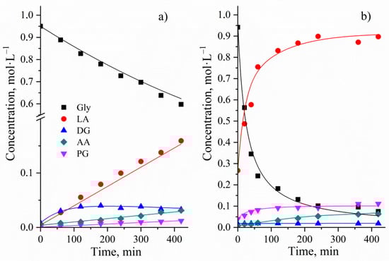It should be noted that we have not found intermediate products (GA, DHA, pyruvaldehide (PA)) in all the experiments. This indicates an instantaneous reaction on the route glycerol (GLY)→LA. In addition to that, the authors [35] showed the complete conversion of PA into LA at 323–373 K.