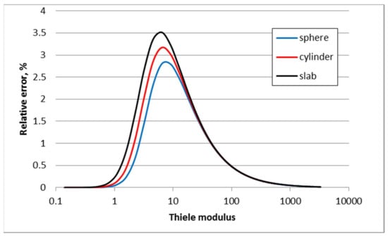 Relative errors in the effectiveness factors for the three standard geometries as functions of Thiele modulus.