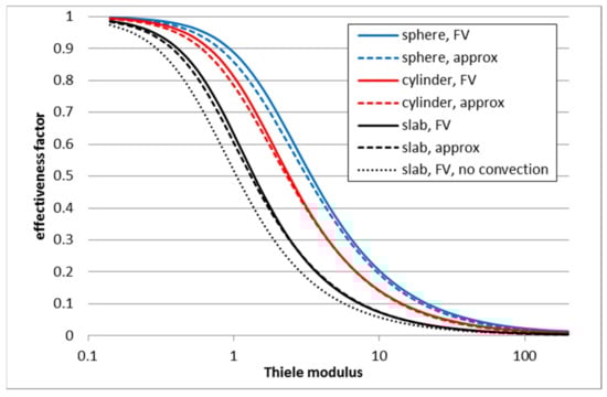It can be seen that the approximate solution approached the analytical solution asymptotically both for relatively low and very high Thiele modulus values. For the intermediate regime, the maximum relative error was around 3% and the maximum absolute error around 0.01 for predicted effectiveness factors. For cylindrical geometries, analytical solution was not possible above Thiele modulus values above 700 due to problems in the Matlab function “besseli” (the present approximate solution was nevertheless found rapidly); however, already smaller Thiele modulus values proved that the asymptotic behavior observed in Figure 1 holds also for cylinders.