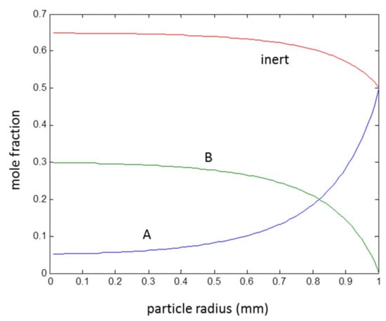 Further tests were carried out with the same reaction scheme as before; however, specifying surface compositions as 50 mol % reactant A and 50 mol % of inert. This deviates from the previous case since inert is accumulating in the catalyst interior due to convective flux; its convective flux towards the center was balanced by a diffusion flux out. This behavior (solution of composition profiles with the FV model) with Thiele modulus of 10 and m = 2 (spherical geometry) are shown in Figure 5.