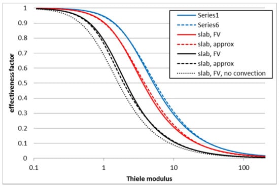 Although this case may seem to be close to the first test case, the reaction was non-equimolar inducing total convective flux towards the catalyst center. In this case, total flux increased effectiveness factor as net convection towards catalyst center carries reactants further along with diffusion. In Figure 4, the effectiveness factors predicted by the finite volume method and the corresponding effectiveness factors predicted by the present approximate solution are shown as functions of Thiele modulus. Here, the classical definition of Thiele modulus [4] was used for x-axis instead of definition by Equation (27). Maximum error in the effectiveness factors were 0.028 for slab and cylinder and 0.038 for sphere. For comparison, the effectiveness factors calculated with the finite volume method but neglecting convective mass transfer are shown. This was done so that the total fluxes in the finite volume solution were set to zero and the last material balance was replaced by the summation equation. Without this replacement, the finite volume model did not converge. However, it must be noted that the RDC equation was not satisfied for the last component after this modification. The maximum error in the effectiveness factor when neglecting total flux was around 0.11, and it was the same for all geometries. Results for the slab geometry are shown to keep the graph simple. It can be seen that the present approximation follows the rigorous solution closely, with the error being much smaller compared to the error caused by a regrettably common assumption of negligible convective flux.