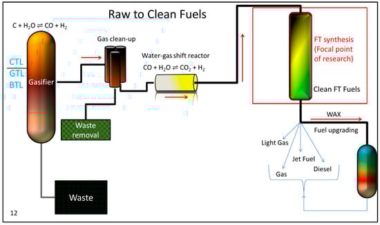Fischer–Tropsch synthesis (FTS) is a pseudo-polymerization synthesis that is a key step in Gas-to-Liquids (GTL) [1,2,3], Coal-to-Liquids (CTL) [4,5,6,7], and Biomass-to-Liquids (BTL) [8,9,10] processes, as displayed in Figure 1. Briefly, there are three main steps that are undertaken to produce materials. The first step is syngas production from natural resources, primarily materials that are of local natural abundance. To generate the raw syngas, these raw materials are first processed by gasification (in the case of coal or biomass) or steam reforming/partial oxidation (in the case of natural gas). The actual chemistry depends on which raw materials are to be locally utilized. The overall chemical reactions are provided below: