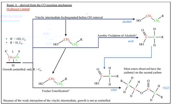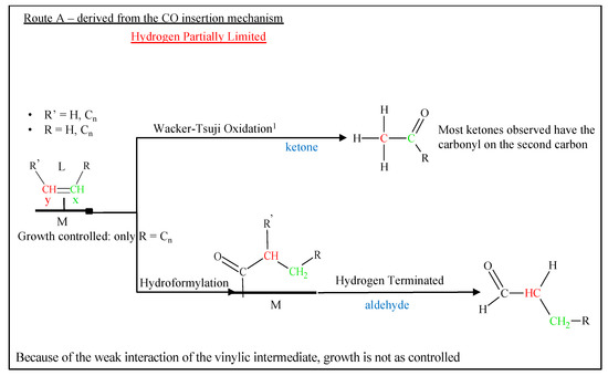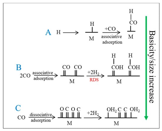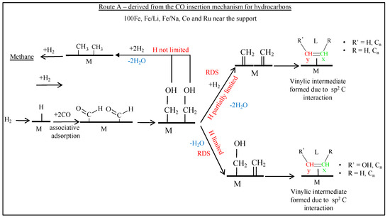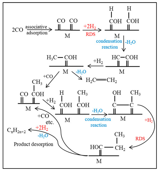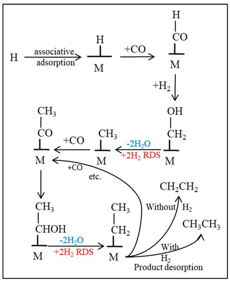Another commonly proposed mechanism is CO insertion [50], which is displayed in Figure 5, where the CO is molecularly adsorbed onto the active catalyst, and it undergoes bond scission only after being incorporated into the chain. Again, the proposed rate-limiting step is the hydrogenation of CO to the CH2 methylene group. The assumed monomer for this mechanism is simply CO through its insertion into metal-carbon bonds. Interestingly, CO insertion is a common step in homogenously catalyzed reactions, such as hydroformylation [51]. The mechanism continued to be scrutinized, and even the primary versus secondary products are still subject to debate; several research groups are focused on shedding light on this topic [52,53,54].