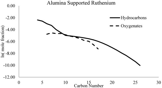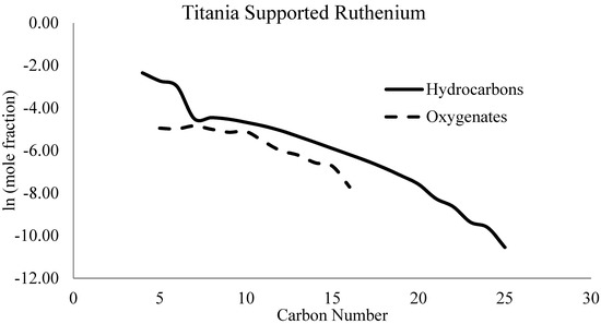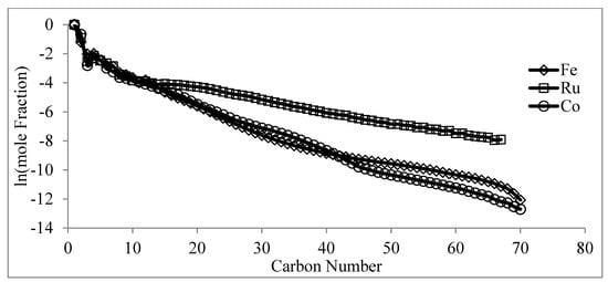 The ASF polymerization model assumes that the hydrocarbon chain lengths are independent, and thus, solely dependent on rp and rt. The distribution of FTS products can then be plotted in a linear manner with the natural log of the mole fraction as the dependent variable, y, and the carbon number as the independent variable, x, as shown in Figure 6 for iron, cobalt, and ruthenium catalysts.