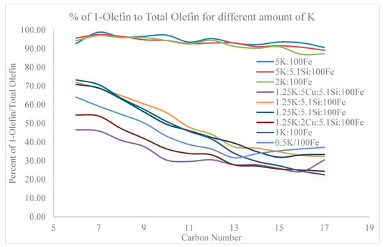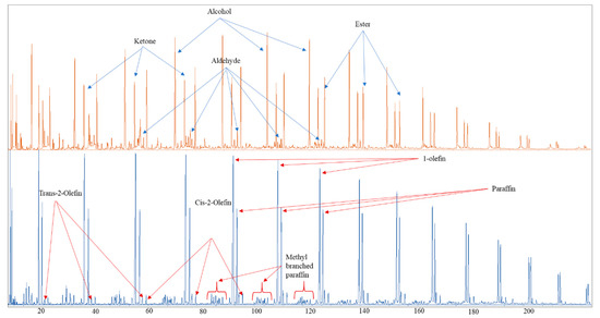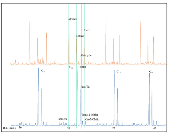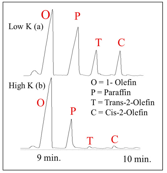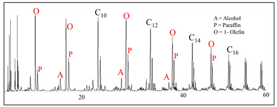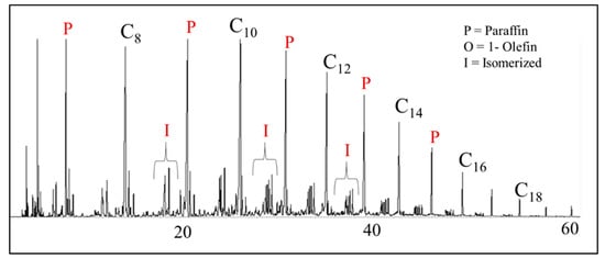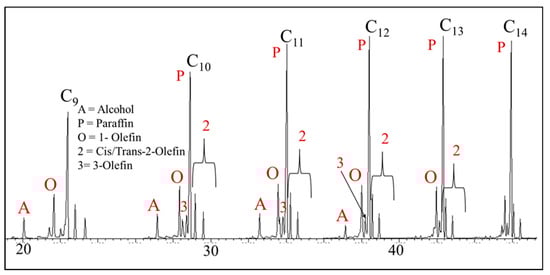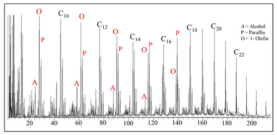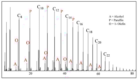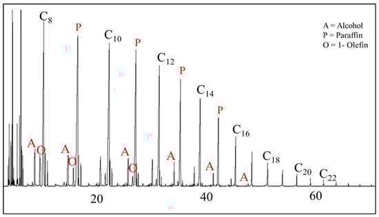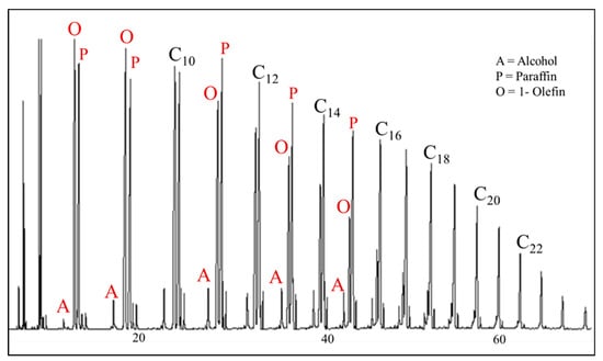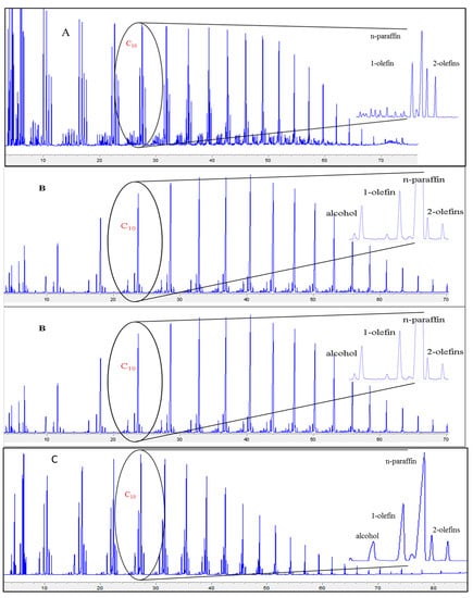 The four primary classifications of FTS hydrocarbon products are: 1-olefins, paraffins, trans-2-olefins, and cis-2-olefins. To give an idea of the vast array of products, Figure 8 displays chromatograms of merely the oil phase (excluding gas, aqueous, and wax phases) for the distribution of products for iron (A) cobalt (B), and ruthenium (C) catalysts. General examples of a flame ionization detector (FID) scan (Figure 8) displays weight fractions of each major component, which can significantly vary, depending on the active metal. The effect of chain length on selectivity depends on the process conditions (e.g., temperature, pressure, H2/CO ratio) and the type of reactor (e.g., slurry or fixed-bed). Chain length affects the olefin/paraffin (O/P) ratio [74,75,76,77,78,79,80,81] through differences in re-adsorption that, in turn, affect secondary reactions, such as hydrogenation, isomerization, and the re-initiation of chain growth [76,80,81]. Hydrocarbon chain length also influences the olefin/paraffin ratio by the disproportional accumulation of heavier products due to the decreasing vapor pressure with increasing chain length, particularly in slurry-based FTS systems [77,82]. As residence time increases, re-adsorption increases in a proportional manner; thus, an inverse relationship arises where, the longer the hydrocarbon chain, the lower the O/P ratio (as n increases, O/P decreases). Figure 8 visually describes this attribute (in this case using an iron catalyst), where the olefinic component more rapidly decreases with the carbon number in the FID chromatograph.