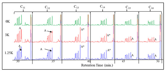 A chromatographic picture comparing different branched materials ranging from C11–C16. This is mixed oils from several iron runs where the oils were exposed to H2 at 0.68 bar for 5 min. using Pt/C catalyst converting all olefinic materials to alkanes. A is the linear alcohol, A* is where the alcohol is buried behind the 3-methyl branched paraffin. Otherwise, the order of methyl paraffins—starting from the n-paraffin going right to left; 3-methyl, 2-methyl, 4-methyl, 5-methyl, etc. All runs at 230 oC, 12.1 bar, 0.7 H2/CO, with a WHSV of 2.