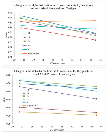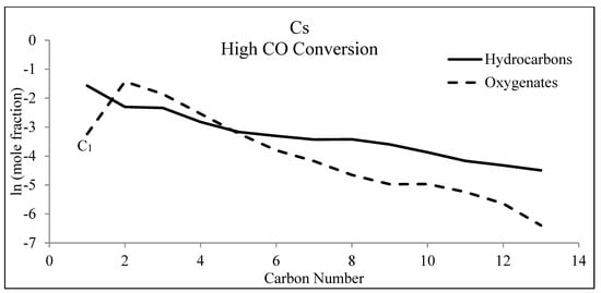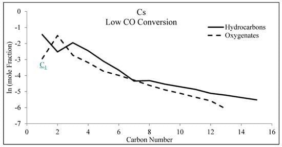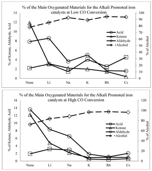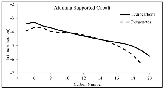 A minor fraction of the distribution, which consists of oxygenated products (Figure 11 and Figure 12), is also important. For example, oxygenates can be used to investigate the mechanism of FTS [46,47,82] or serve as alternative chemicals. FTS catalysts have been altered in a specific manner with the intent of increasing the selectivity to oxygenates with the aim of producing alternative chemicals (e.g., chemical feedstocks) [40,41,42,83,84]. Two variables that affect product distribution [44] and that were controlled by changing catalyst formulation, include metal (e.g., alkali) promoters for iron, and support type (as well as the interfacial contact between support and metal) for supported cobalt and ruthenium catalysts.