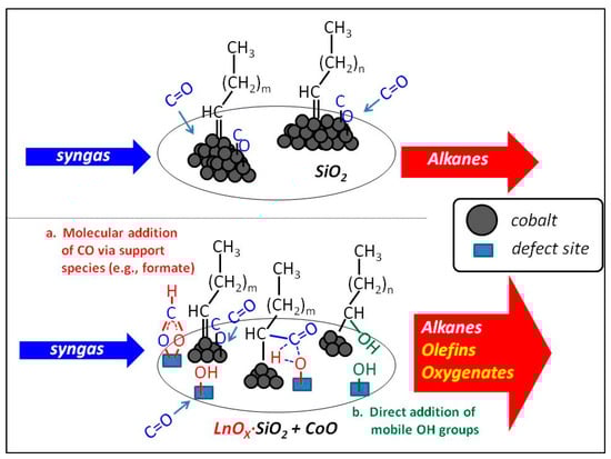 Cobalt, the other active metal that is utilized in industry for FTS, is normally paired with the GTL process. Cobalt, unlike iron, possesses very low intrinsic WGS activity, and it is thus more useful for higher H2/CO ratio syngas, such as that derived from natural gas. Because cobalt is expensive, it is typically supported on materials, such as Al2O3, SiO2, and TiO2, in order to produce nanoparticles that improve the fraction of exposed surface cobalt atoms [32]. The control of interactions between the active cobalt and the support is a balancing act. Poor interactions lead to the agglomeration of cobalt particles, resulting in lower CO conversion on a per gram catalyst basis [33]. However, if the interaction between the support and the cobalt is too strong, then fine Co particles can lead to low reducibility, and thus reduction promoters (e.g., Pt, Re, and Ru) are often added to facilitate their reduction by hydrogen dissociation and spillover or via a chemical effect [34].