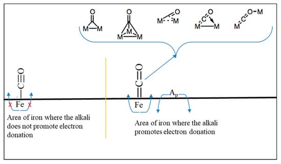 As of now, only four transitional metals are considered active for FTS: cobalt, iron, ruthenium, and nickel. Given that nickel has been plagued as a methanation catalyst, and simply due to the price of ruthenium, only cobalt and iron have typically been considered for industrial use to date [27,28]. Iron is the most abundant metal, and it is thus less expensive than cobalt. Iron is also preferred for industrial applications, where coal is the natural resource used to produce the syngas. The low level of H2 in the syngas is due to the high abundance of naphthalene-based materials, molecules that contain more carbon than hydrogen. Iron is also different in that, as understood today, iron carbide, not the metal itself, is the active species. In addition, iron carbide alone is a very low-α (i.e., where α is chain growth probability) catalyst, and normally an alkali promoter, such as potassium, is added to increase the dissociation rate of CO, allowing for α to increase [29,30]. Copper is normally added as a promoter as well, to enhance the reducibility of iron oxides during activation [31].