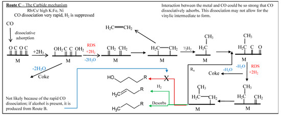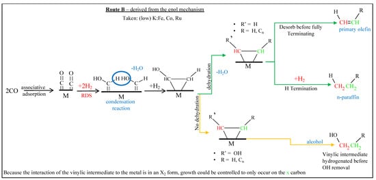 Fischer, discerning that the synthesis route involved the formation of aliphatic carbon-hydrogen bonds and knowing the tendency of iron to form iron carbide, proposed a carbide mechanism, as shown in Figure 3. Although Fischer promoted this mechanism, it was not his first choice; he did not favor the carbide mechanism until results displayed hydrocarbons as the primary products for FTS [44]. Although this mechanism was set aside for a brief period, recent advances in surface science revealed that the catalysts displayed a high surface coverage of carbon, with little surface oxygen, and revived the idea that hydrocarbon products could be synthesized through the combination of methylene groups [45,46,47,48,49]. In the carbide mechanism, CO dissociatively adsorbs on the active FTS metal, covering the surface with carbon and oxygen atoms. The adatoms are sequentially hydrogenated, forming water and methylene monomer. Previous work that was done by Ojeda et al. discusses the quasi-equilibrium assumption for the dissociation and hydrogenation of CO within the first hydrogenation step; the second step is assumed to be rate-limiting [50]. Fischer first proposed a mechanistic route involving oxygenate intermediates for FTS, as very little aliphatic material was generated, and the products were mostly comprised of alcohols. Although the carbide mechanism gained ground after being proposed by Fischer, work that was conducted by Kummer and Emmett [46,47] once again gave rise to an oxygenate mechanism [49]. The detailed example within Figure 4 is currently known as the enol mechanism.
