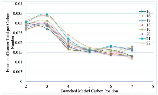 The isomerized materials, although minor, can be observed from the gas range up to the longer chains in the oil fraction. Most of the branching that occurs in FTS is single methyl branched material, as shown in Figure 9 and Figure 10. The diversity of these materials depend on the specific carbon number and, as the carbon number increases, the more diverse the methyl-branched paraffin become.
