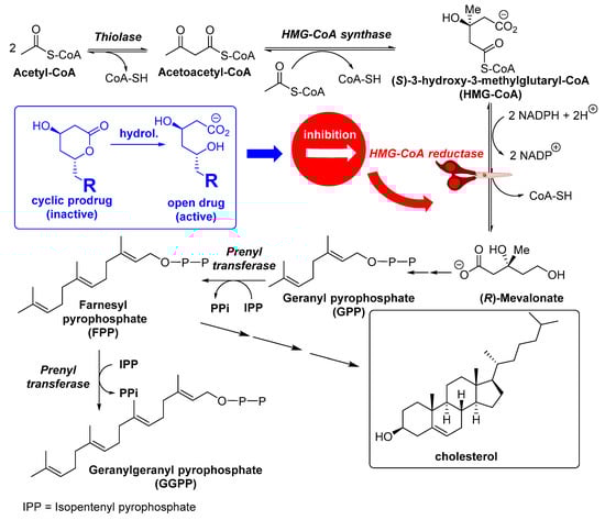 As mentioned before, these drugs act by reversibly and competitively inhibiting the bioreduction of S-3-hydroxy-3-methylglutaryl-coA (HMG-CoA), the rate-limiting step of the mevalonate pathway in cholesterol biosynthesis (Figure 2), because of the chemical similitude with mevalonyl-CoA, the intermediate obtained after the first reduction of HMG-CoA. Furthermore, there is extensive recent evidence suggesting that statins are more than simple lipid-lowering drugs [3,26]; in fact, a large amount of up-to-date experimental data have confirmed that statins may exert many different potentially beneficial therapeutic effects, by several mechanisms not essentially related to cholesterol metabolism. These so-called pleiotropic effects [27] could be attributed to their ability to prevent the conversion of HMG-CoA to R-mevalonate, which results in the concomitant inhibition of the downstream biosynthesis of cholesterol, as well as of numerous isoprenoid metabolites, such as geranylgeranyl pyrophosphate (GGPP) or farnesyl pyrophosphate (FPP), as shown in Figure 2.