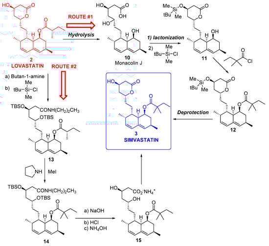 Because of the economic importance of simvastatin, as mentioned in the Introduction, various multistep syntheses of 3 starting from 2 have been described; thus, a widely used process (route #1) starts with the hydrolysis of the C8 ester in 2 to yield the triol Monacolin J 10, followed by selective silylation of the C13 alcohol to yield 11, esterification of C8 alcohol with dimethylbutyryl chloride to furnish 12, and deprotection of C13 alcohol to finally yield 3 [163] (Figure 3).