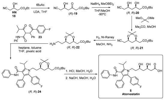 The chemical synthesis of atorvastatin originally described by researchers at Warner-Lambert Company [171], shown in Figure 5, started from a chiral building block, ethyl (R)-4-cyano-3-hydroxybutyrate 18, also known as “hydroxynitrile” (HN), and the second stereogenic centre of 20 was obtained by diastereomeric induction, using cryogenic borohydride reduction of a boronate derivative of the 5-hydroxy-3-keto intermediate 19 derived from HN.