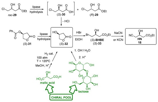 Hydrolases are also useful for preparing (S)-3-hydroxy butyrolactone (S)-32, another enantiopure intermediate to furnish HN (Figure 7). In fact, opening of (S)-32 with HBr/EtOH will yield the corresponding ethyl (S)-4-bromo-3-hydroxybutanoate ((S)-BHBE, (S)-33) [179], later transformed into HN via SN2 when treated with sodium (or potassium) bromide. Although (S)-32 can be produced from chiral pool raw materials (lactose or malic acid), it can be conveniently obtained by enzymatic hydrolysis of the racemic ethyl 4-chloro-3-hydroxybutanoate (CHBE, rac-29) in the aqueous phase [180]. The lipase stereoselectively hydrolysed only the (S)-enantiomer; however, the resulting acid (S)-30 is unstable, and it readily loses one HCl molecule to give the corresponding lactone of high enantiopurity (>99% ee). However, the enantiopurity of the lactone rapidly decreased when the process was operated at yields of more than 40%. The hydrolysis of the enantiopure benzoic ester of (S)-hydroxybutyrolactone (S)-31 has also been described using lipase from Candida rugosa (CRL) immobilized on amberlite XAD-7 as polymeric support, with ee of 99% [181]. This enzymatic hydrolysis was observed to be non-stereoselective in nature, because the enzymatic hydrolysis of the racemic benzoic ester yielded the racemic lactone, so that a chiral pool precursor (l-malic acid) for this process was necessary. Anyhow, this method has been scaled up to a ton scale, with an overall yield of over 80%, and a reaction time of 14 h [182]. Recently, a platform pathway for the production of 3-hydroxyacids has been described as an alternative biosynthetic route to generate the enantiopure lactone [183].