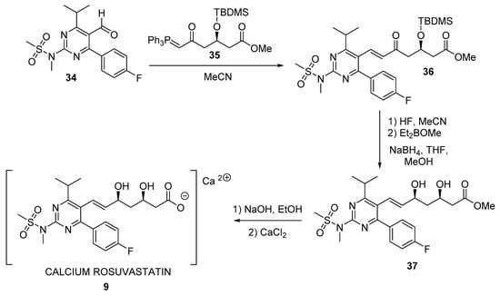 More recently, new biocatalytic approaches employing hydrolases have been described for furnishing the lateral chain of superstatins. Actually, Figure 8 shows a synthetic scheme for preparing rosuvastatin 9. As can be seen, conjugated ketoester 36 is subsequently transformed into final calcium rosuvastatin 9 by different steps (silyl ether cleavage, diastereoselective Narasaka-Prasad [184,185] syn-reduction using diethylmethoxy borane leading to ester 37, and finally ester hydrolysis and salt formation).