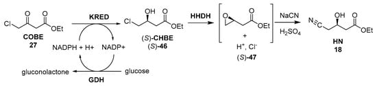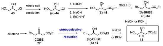 The first synthetic protocols involved kinetic resolutions of prochiral 1,3-dichloropropan-2-ol 43 using microbes, and transformation to dihidroxyester (S)-45 and subsequently to bromohydrine (S)-33 [179]. Later routes have involved asymmetric reduction of ethyl 4-chloroacetoacetate (COBE, 27), produced from diketene, to furnish ethyl (S)-4-chloro-3-hydroxybutanoate ((S)-CHBE, (S)-46), using either chemical or biocatalytic reductions, as previously shown in route #2, Figure 6. Finally, the corresponding halohydrin ((S)-33 or (S)-46) could be converted to HN by treatment with cyanide.
