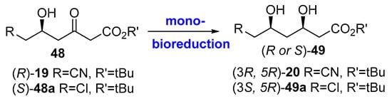 Also using bio-reductions, some other strategies have been developed for the preparation of chiral building blocks for statins synthesis. Thus, Figure 12 illustrates route #3, previously shown in Figure 6, depicting bioreduction of the corresponding 6-substitued-3,5-dioxohexanoates 48 to furnish (R or S)-49 (similar to (R)-19, Figure 6). As depicted in Figure 5, the homochiral intermediate (3R,5R)-20 was originally prepared by diastereoselective chemical reduction of (R)-19, using NaBH4 and MeOBEt2 and, so as to obtain a high diastereoselectivity (>99.5% de), an extremely low temperature (−90 °C) and pyrophoric triethyl borane were demanded [209], with a concomitant extensive energy consumption and substantial amount of waste formation. Another alternative chemical route using chlororuthenium(II) arene/β-amino alcohol as the catalyst for the reduction was described [210], although the diastereoselectivity was insufficient (80% de).