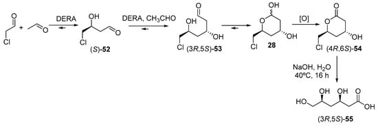 - Liu, J.J.; Hsu, C.C.; Wong, C.H. Sequential aldol condensation catalyzed by DERA mutant Ser238Asp and a formal total synthesis of atorvastatin. Tetrahedron Lett. 2004, 45, 2439–2441. [Google Scholar] [CrossRef]
